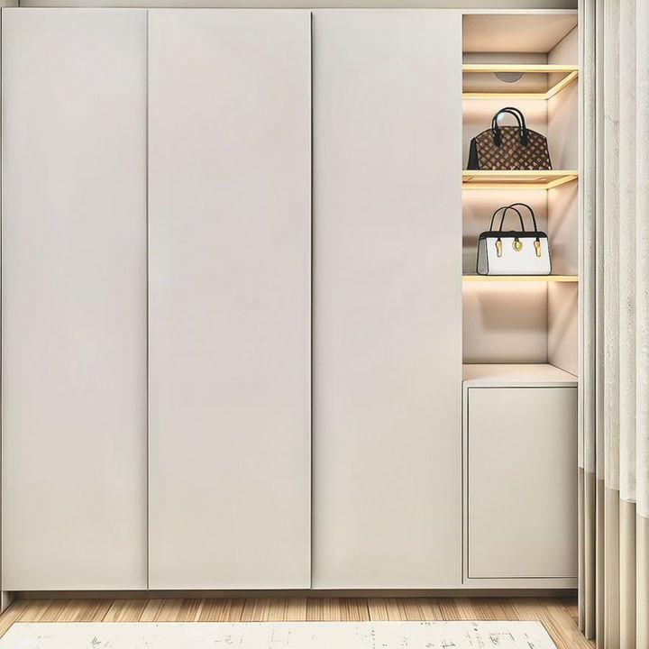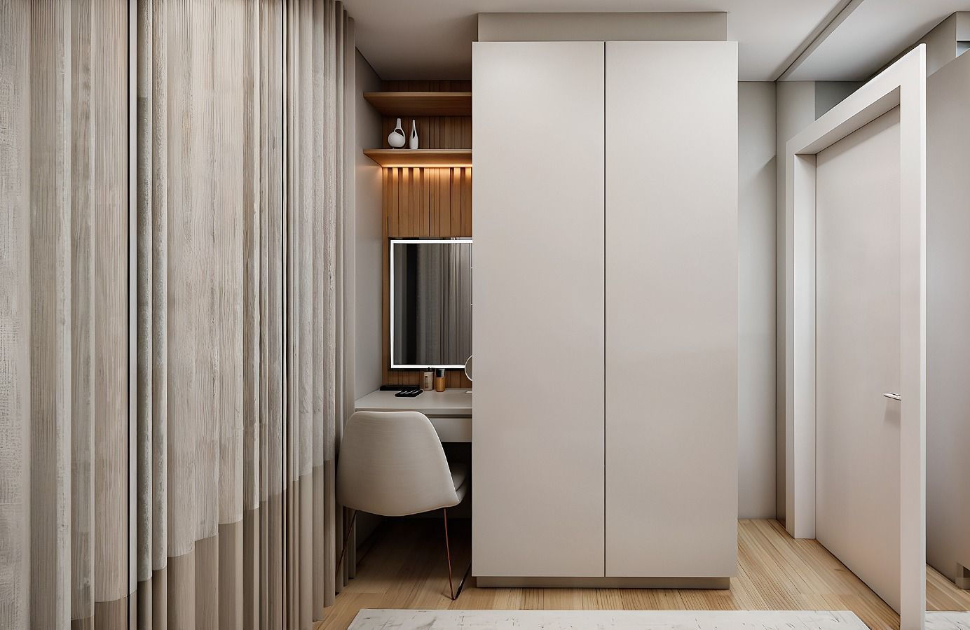 A paleta neutra e atemporal, combinada com elementos em madeira natural e iluminação indireta, constrói uma atmosfera acolhedora e sofisticada. A marcenaria planejada desempenha papel central no projeto, estruturando os espaços, otimizando armazenamento e garantindo unidade visual em todos os ambientes.